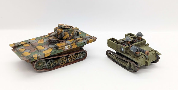 A Vickers Carden Loyd A4E11 Light Amphibious Tank (say that 5 times fast) on the left provides "heavy armor" support. Meanwhile the Carden Loyd Mk IV on the right provides "light armor" support. There is very little difference rules as written between the two, mechanically speaking. Both get 2 cards, one for their driver, one for their gunner, and both have medium machine guns as weapons. I'll have to figure out how to flavor them with traits, to make them interesting and unique!That's it for the first wave of KMT troops. In my backlog for reinforcements I have a mountain gun, an airplane, and some more basic riflemen infantry, plus their over all leader, as far as lore is concerned. I'm very happy with this though, and these lads mark the first major faction for my Xiǎo Yú setting. More on that later.